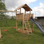 Angrenzend an die mit Grill ausgestattete Sonnen-Terrasse ist eine große Liegewiese mit Kinderspielbereich: Sandkiste, Riesen-Trampolin, Schaukel, Rutsche und Kletterreck.
